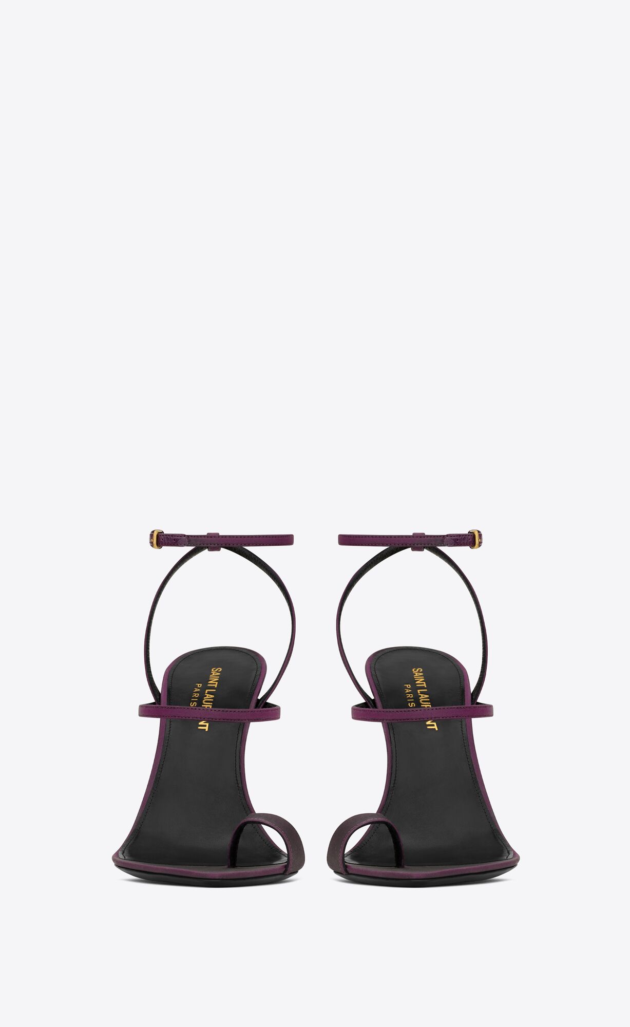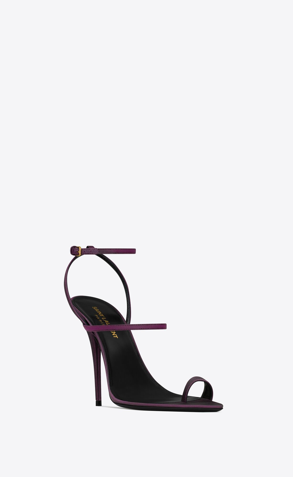 Pointed-toe sandals featuring a buckle strap at the ankle, a strap around the toe and a covered stiletto heel.