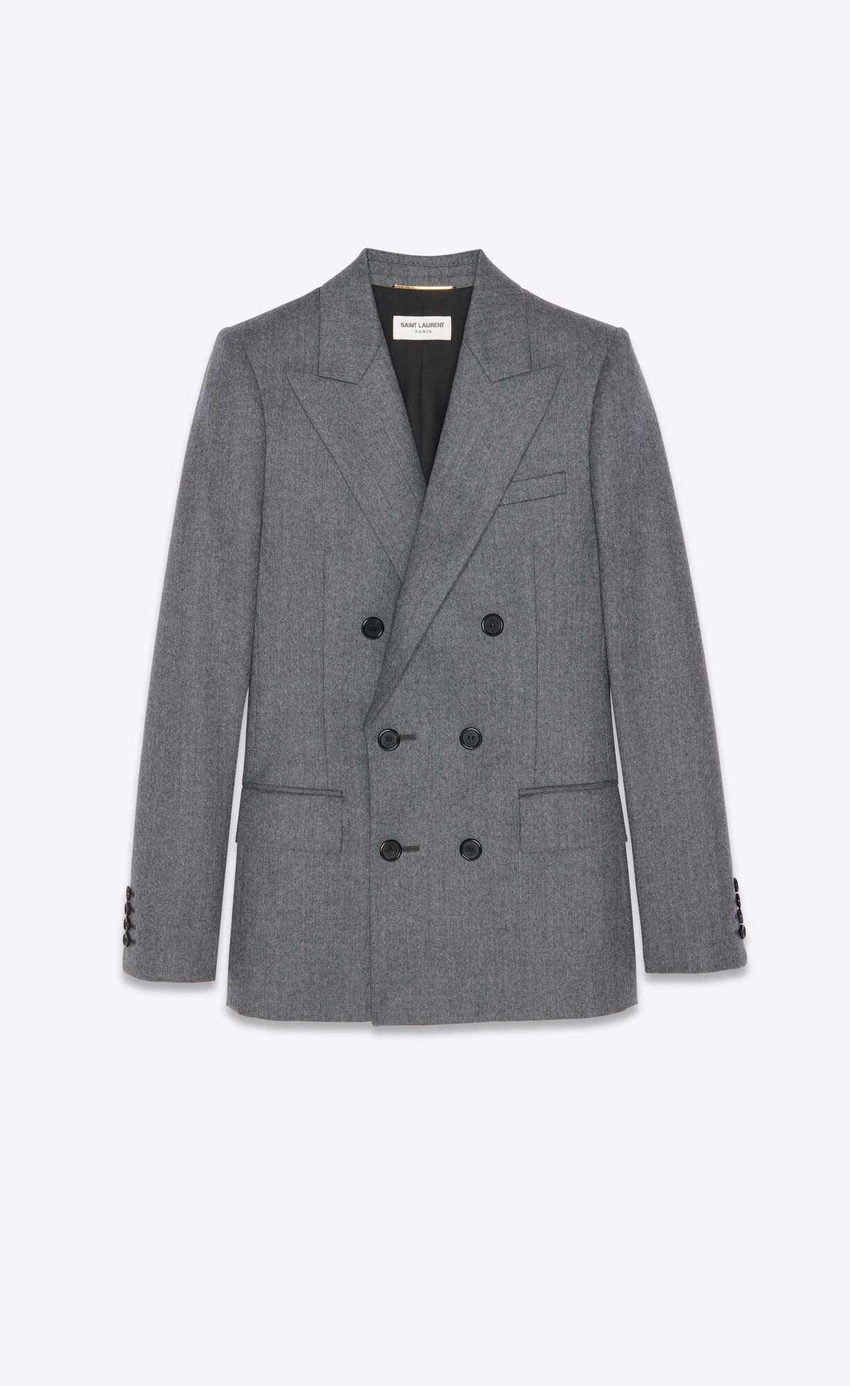 Double-breasted six-button jacket with a peaked lapel, a single back vent and two welt pockets with a flap.