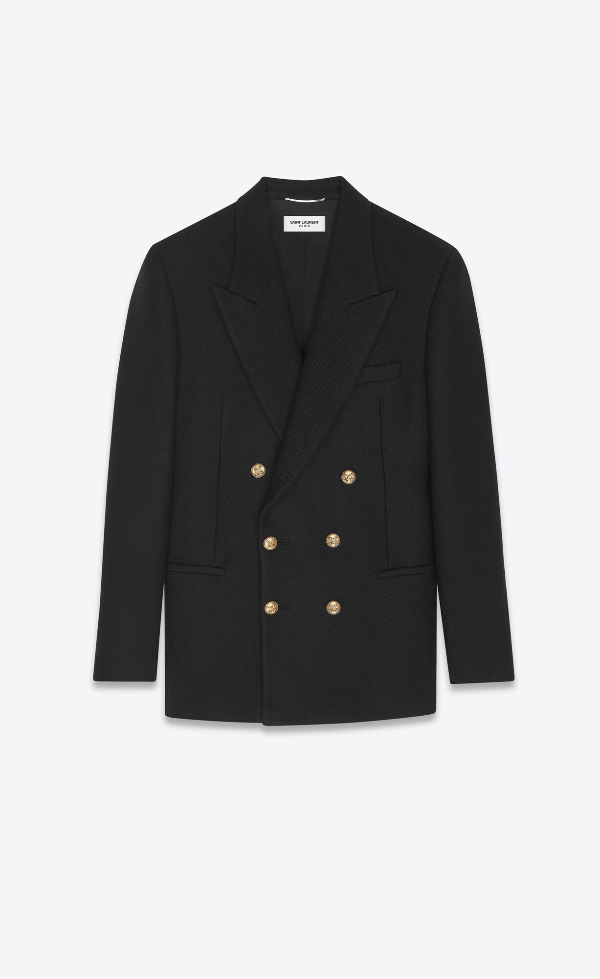 Double-breasted jacket made with recycled camel hair with a peaked lapel, six-button closure, two jetted pockets at the sides and a welt pocket on the chest.
