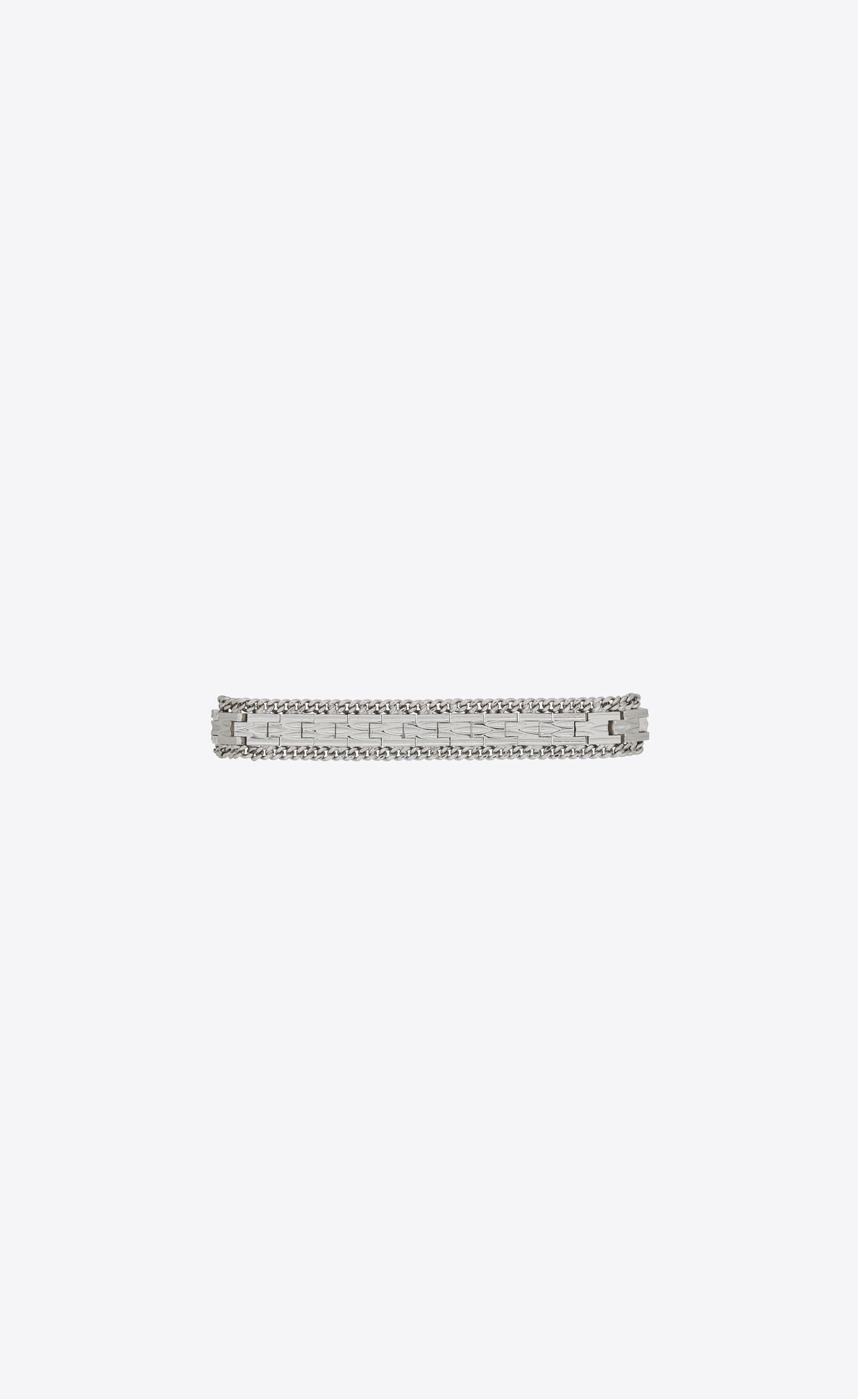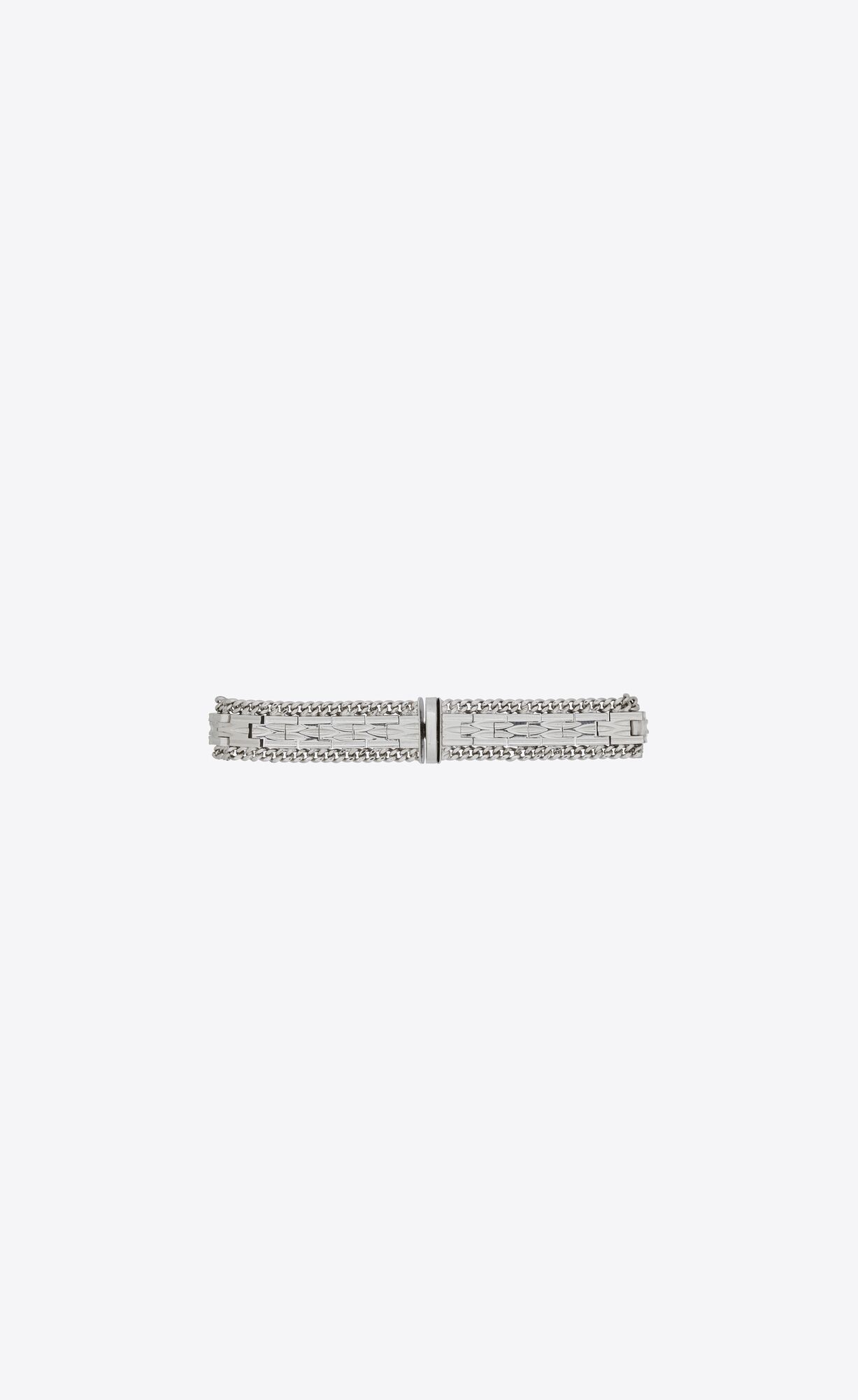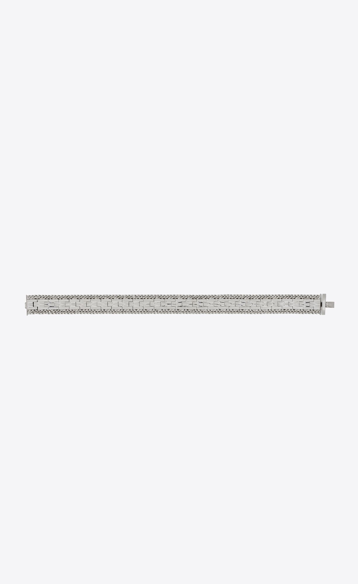 Articulated bracelet with interlocking geometric links framed by curb chains.