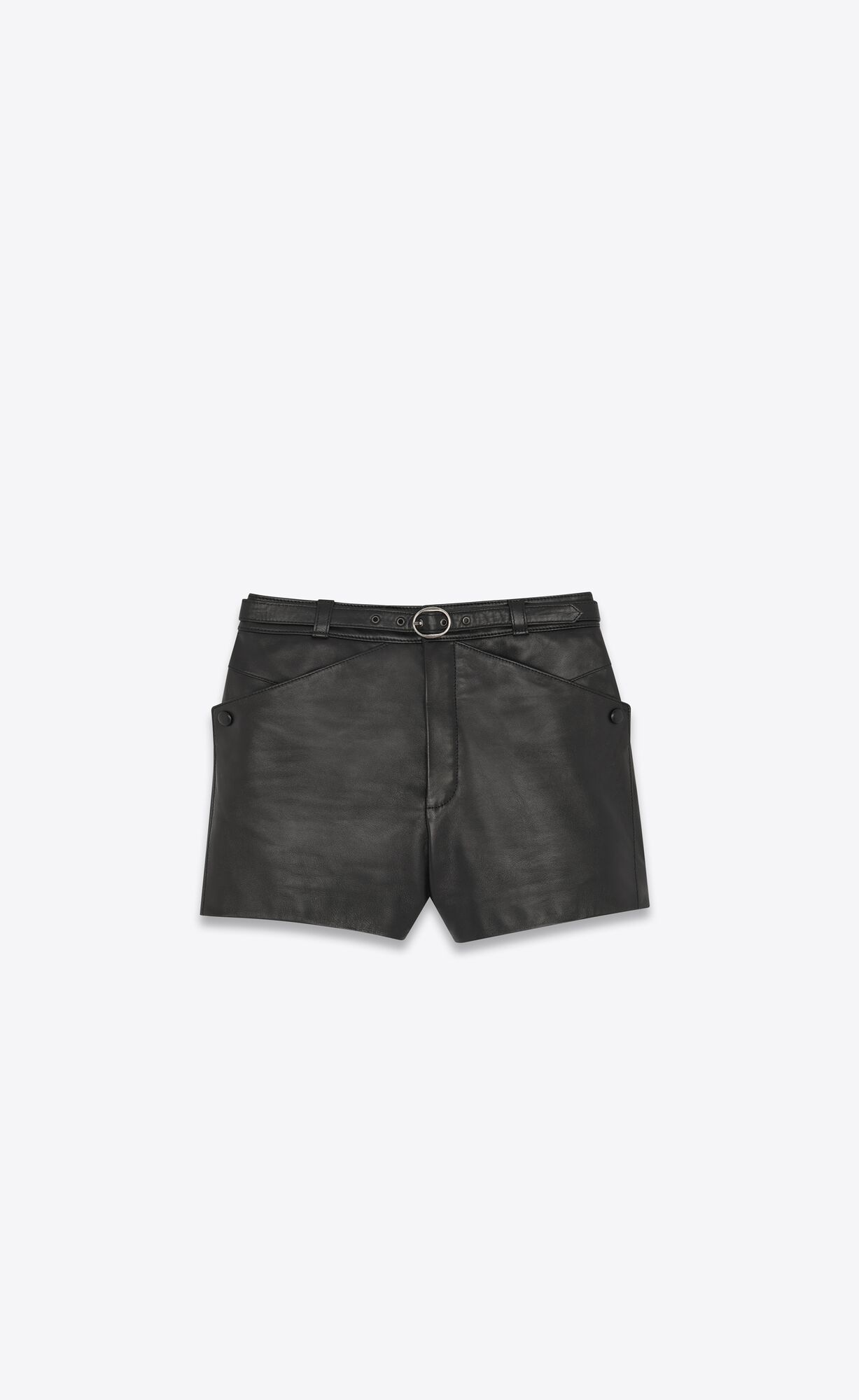 High-waisted shorts with belt on the waist, two slash pockets with press-stud closure and two welt pockets at the back.