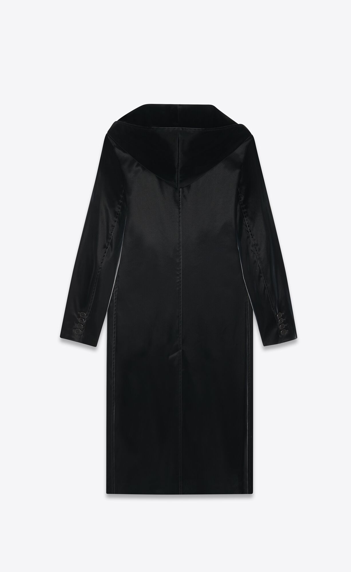 Long hooded coat with concealed button closure and slit pockets at the sides.