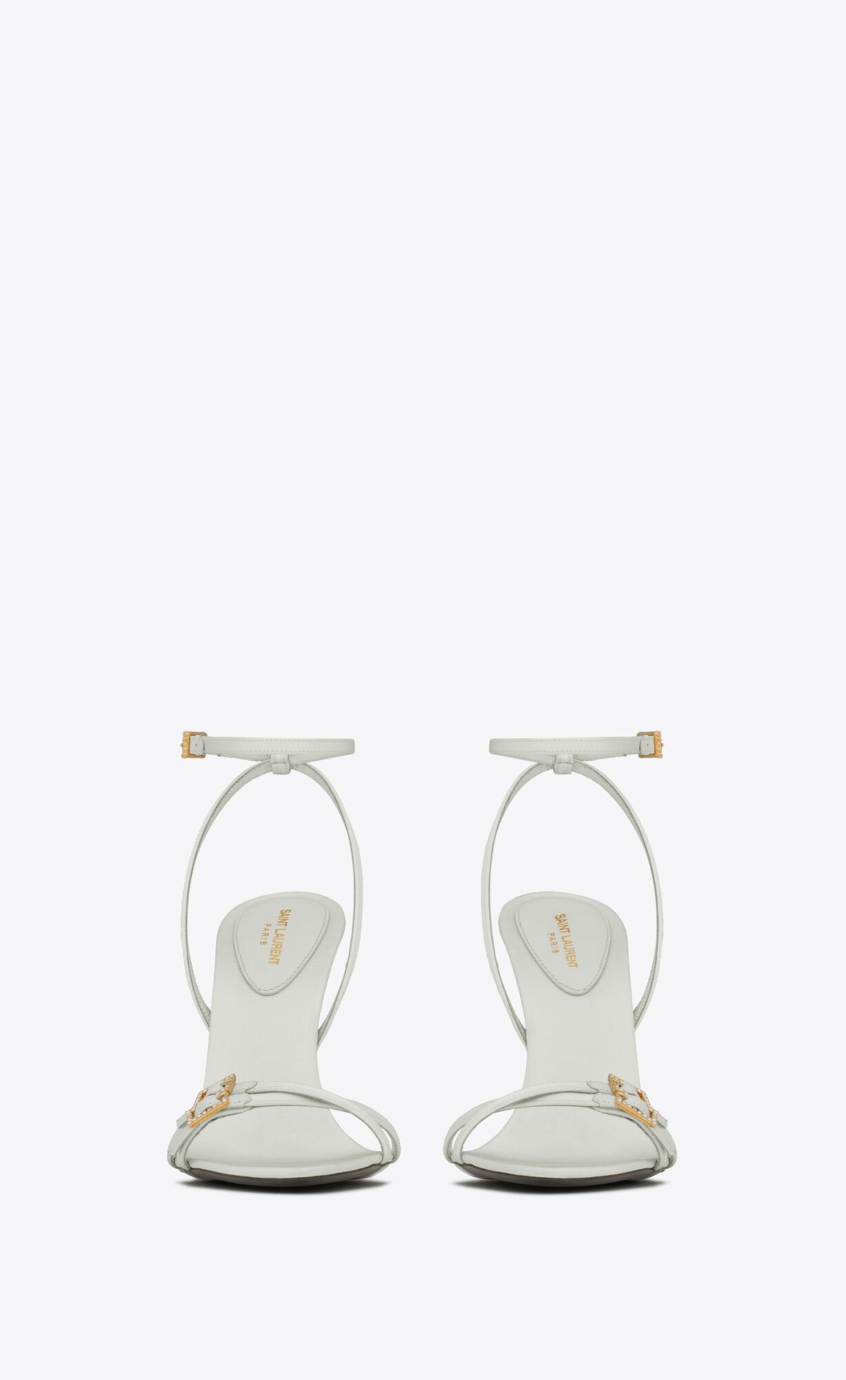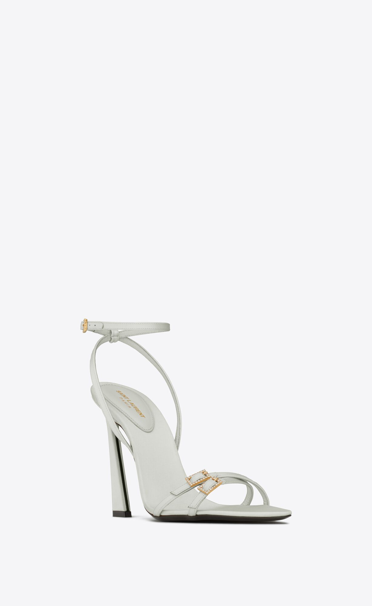 Sandals with an almond toe, covered flared heel and straps with rhinestone buckles.