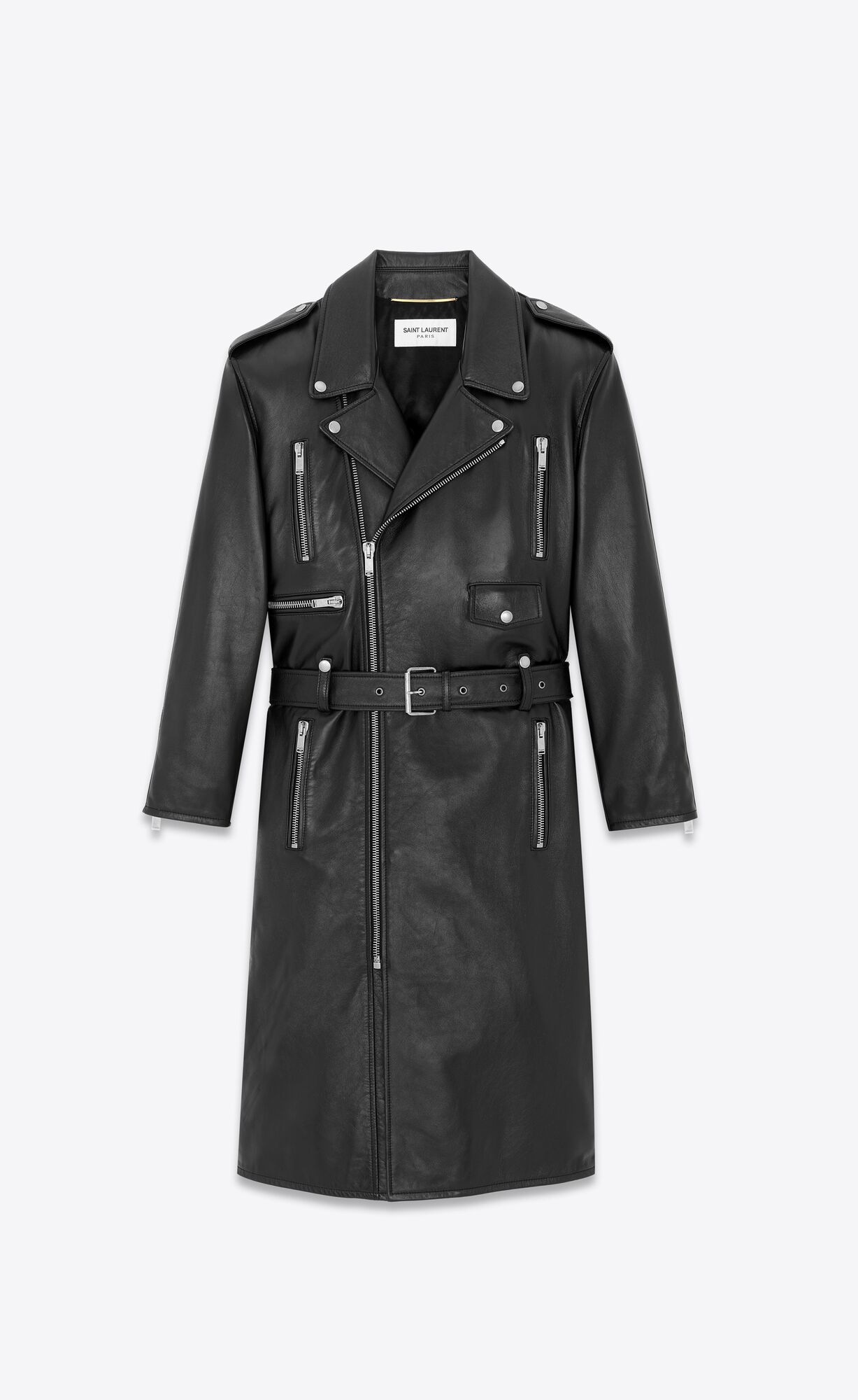 Long jacket with notched lapel and asymmetrical zip closure, buttoned epaulets, shoulder pads and belt on the waist.