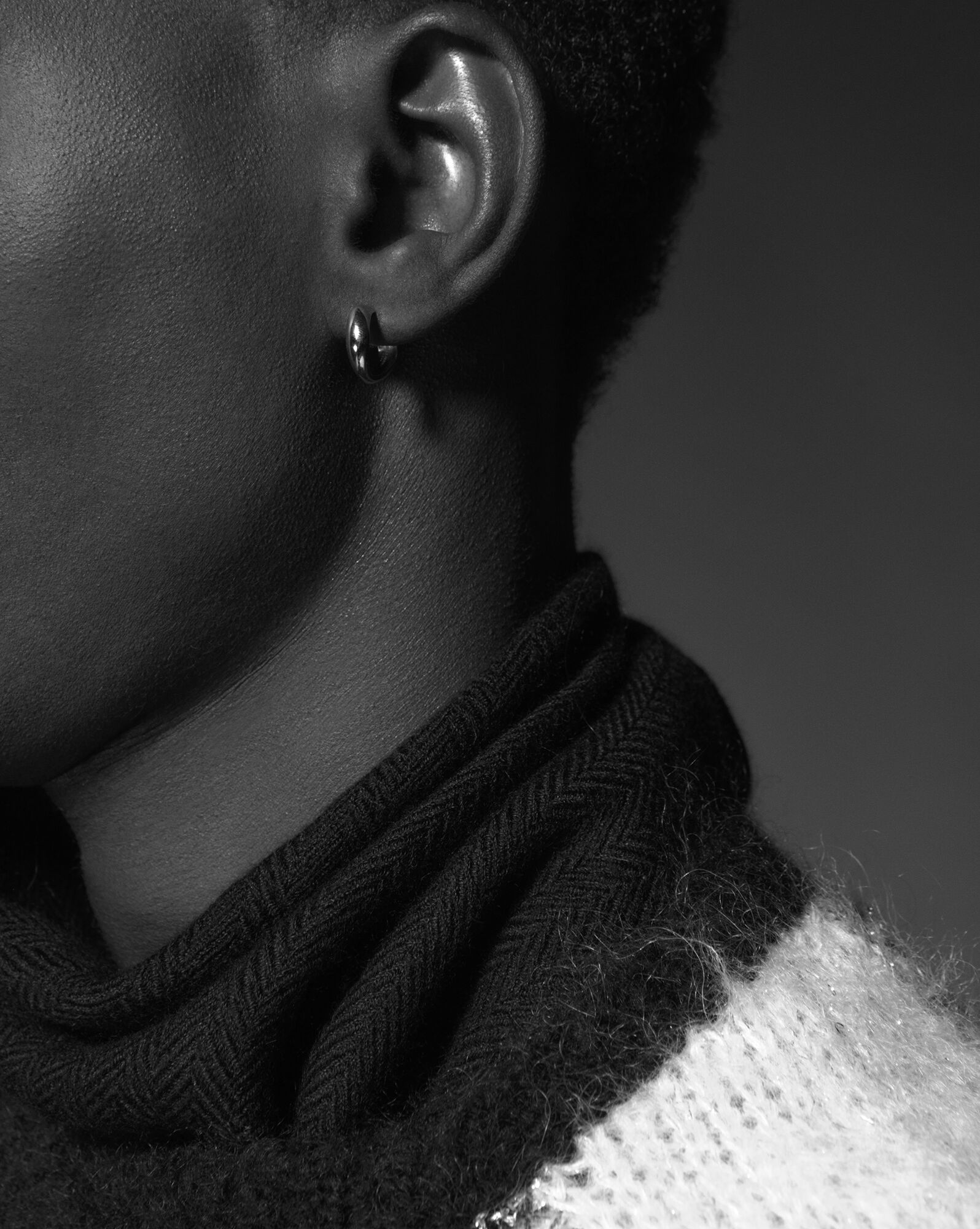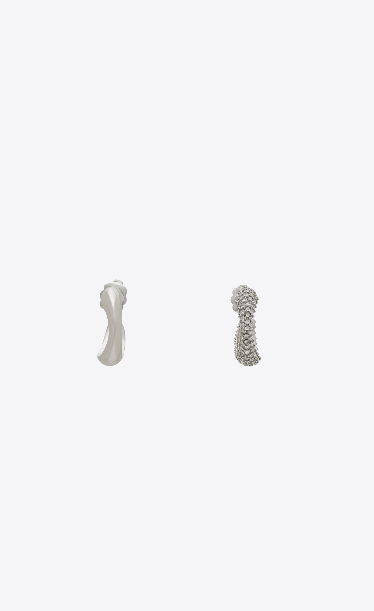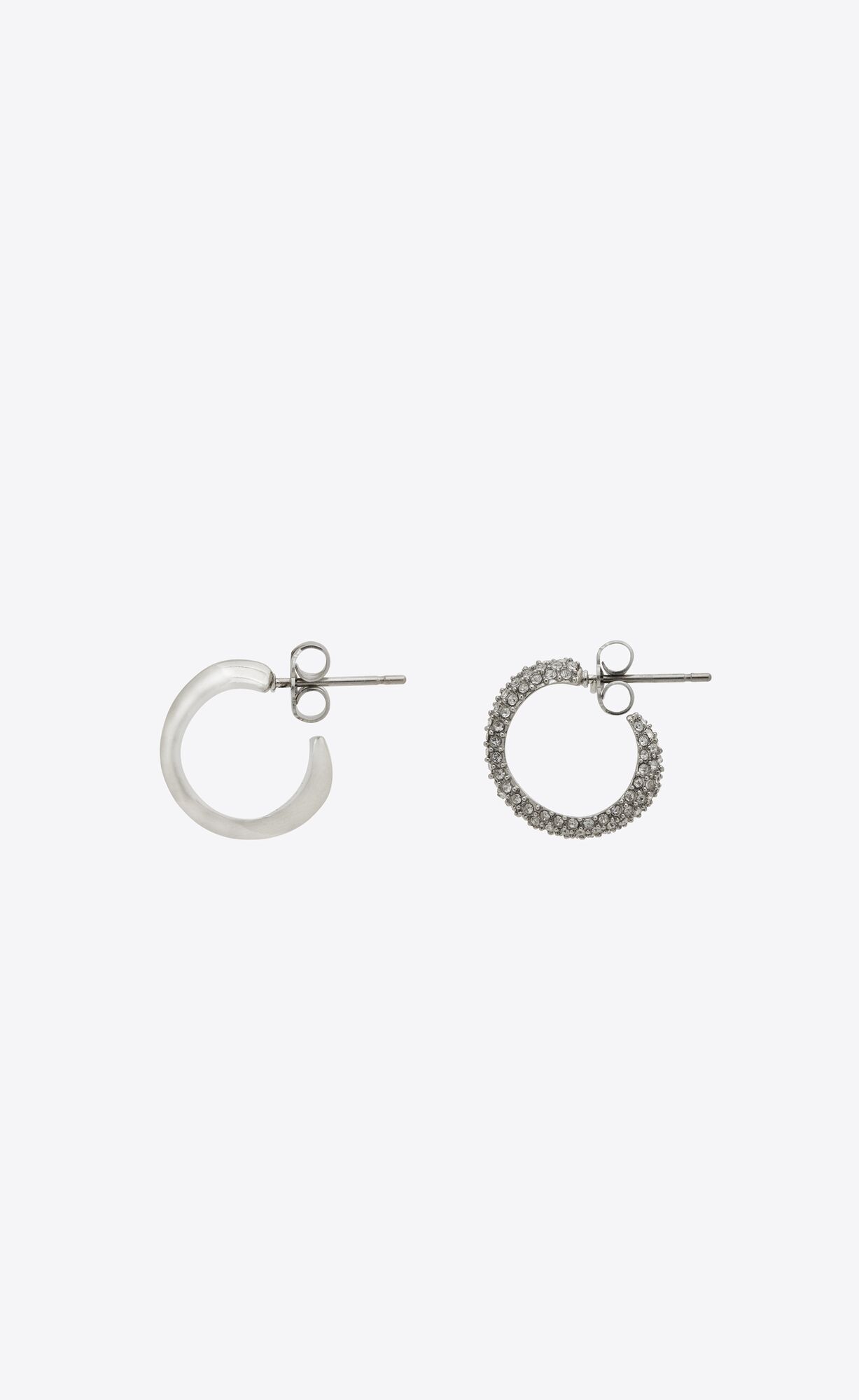 Set of two open-backed mini hoop earrings, one smooth and one embellished with rhinestone pavé.