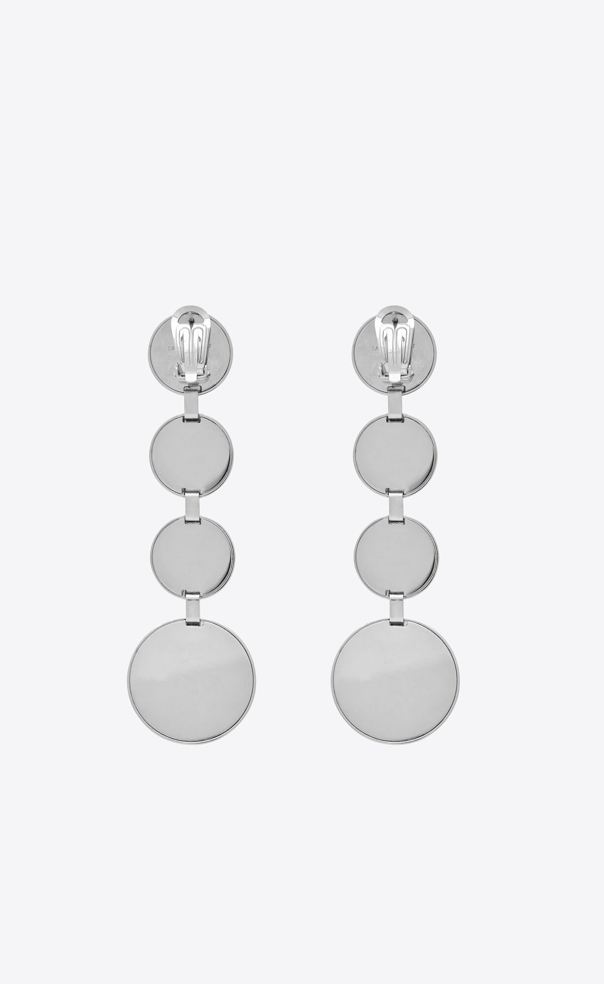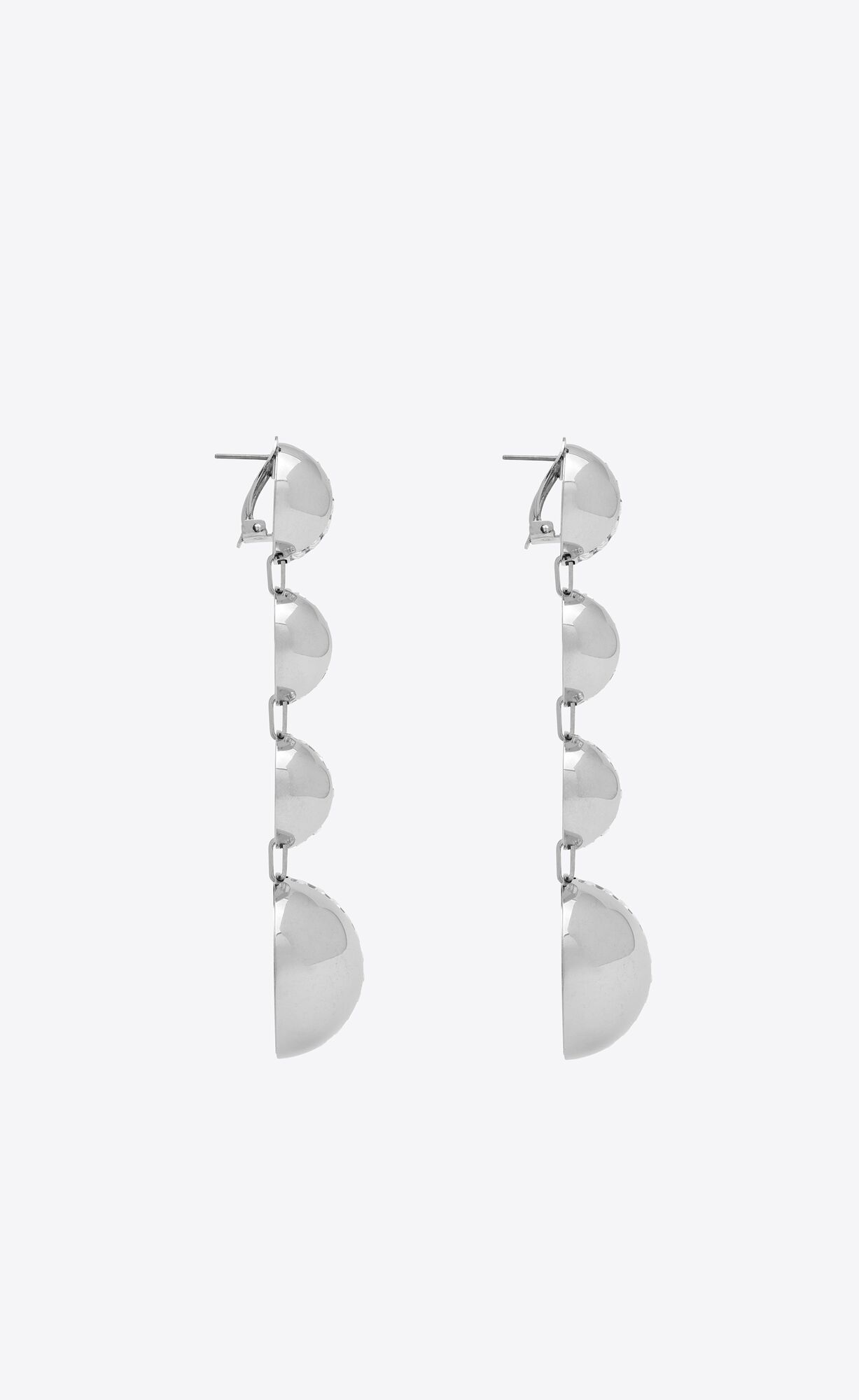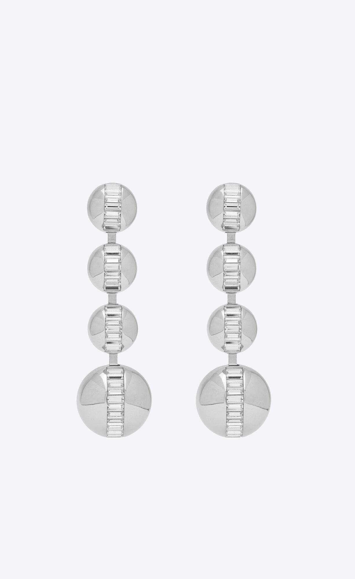Pair of oversized clip-on drop earrings featuring shiny half-spheres decorated with rhinestone baguettes.