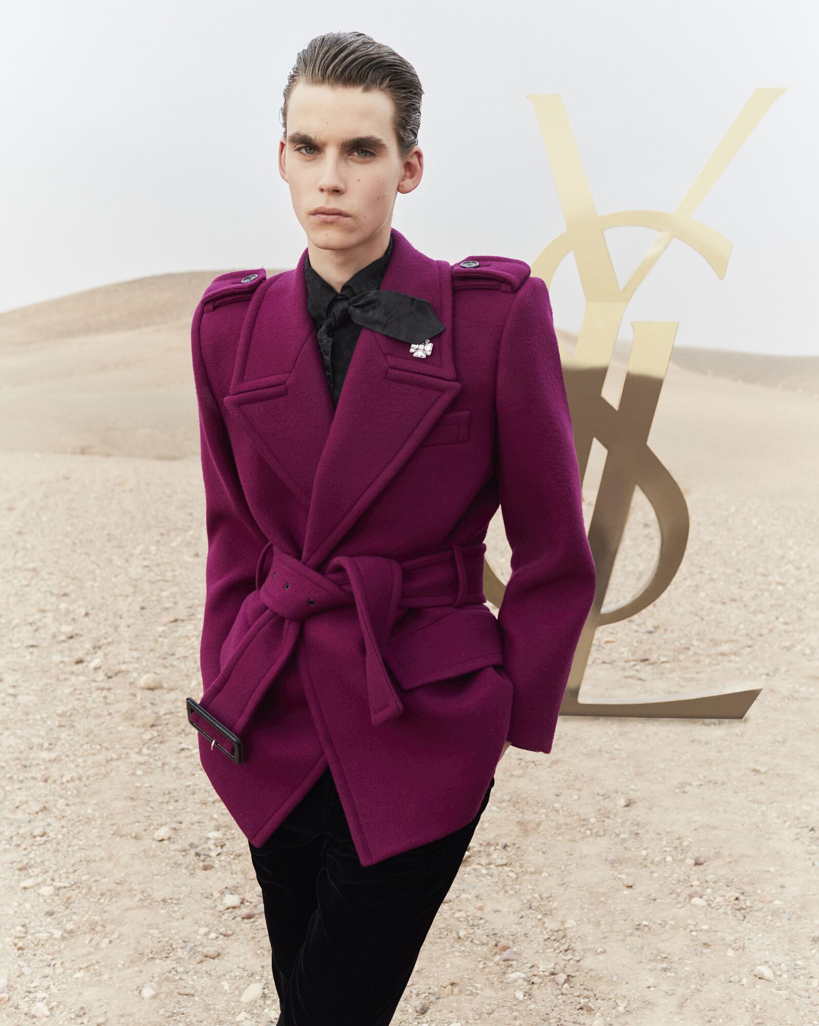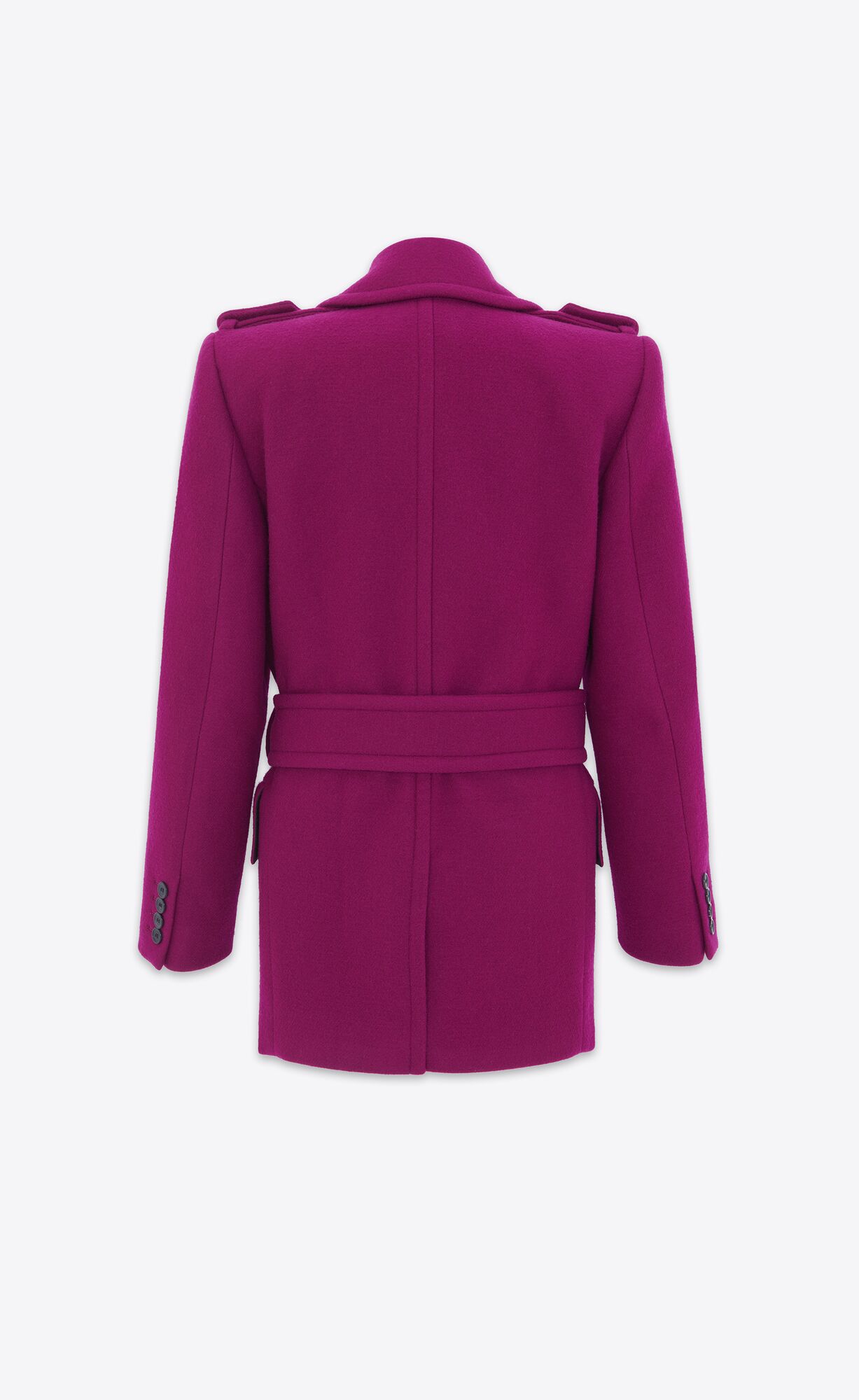 BELTED COAT WITH SHOULDER TABS, JETTED POCKETS AT THE WAIST AND NOTCHED LAPEL.