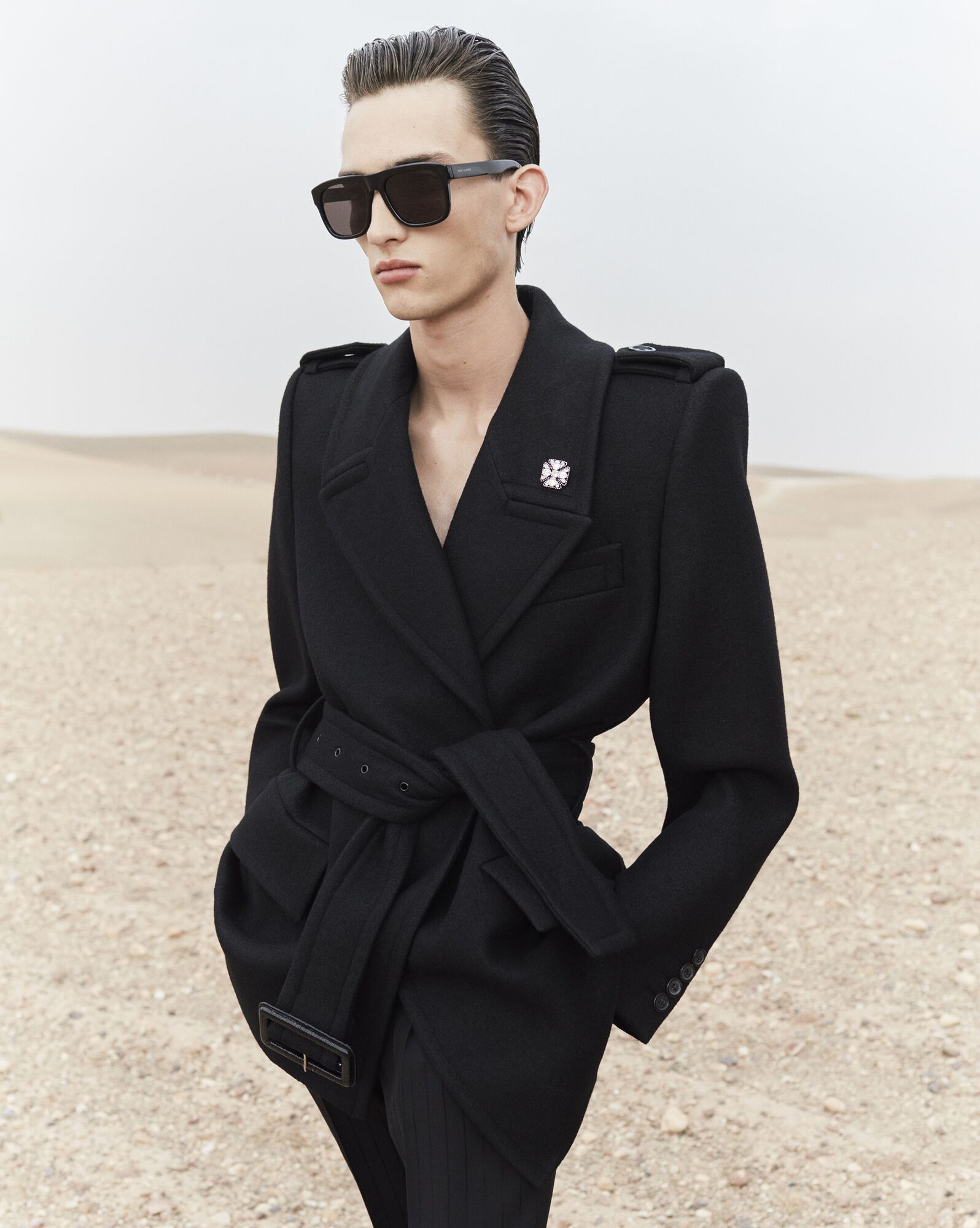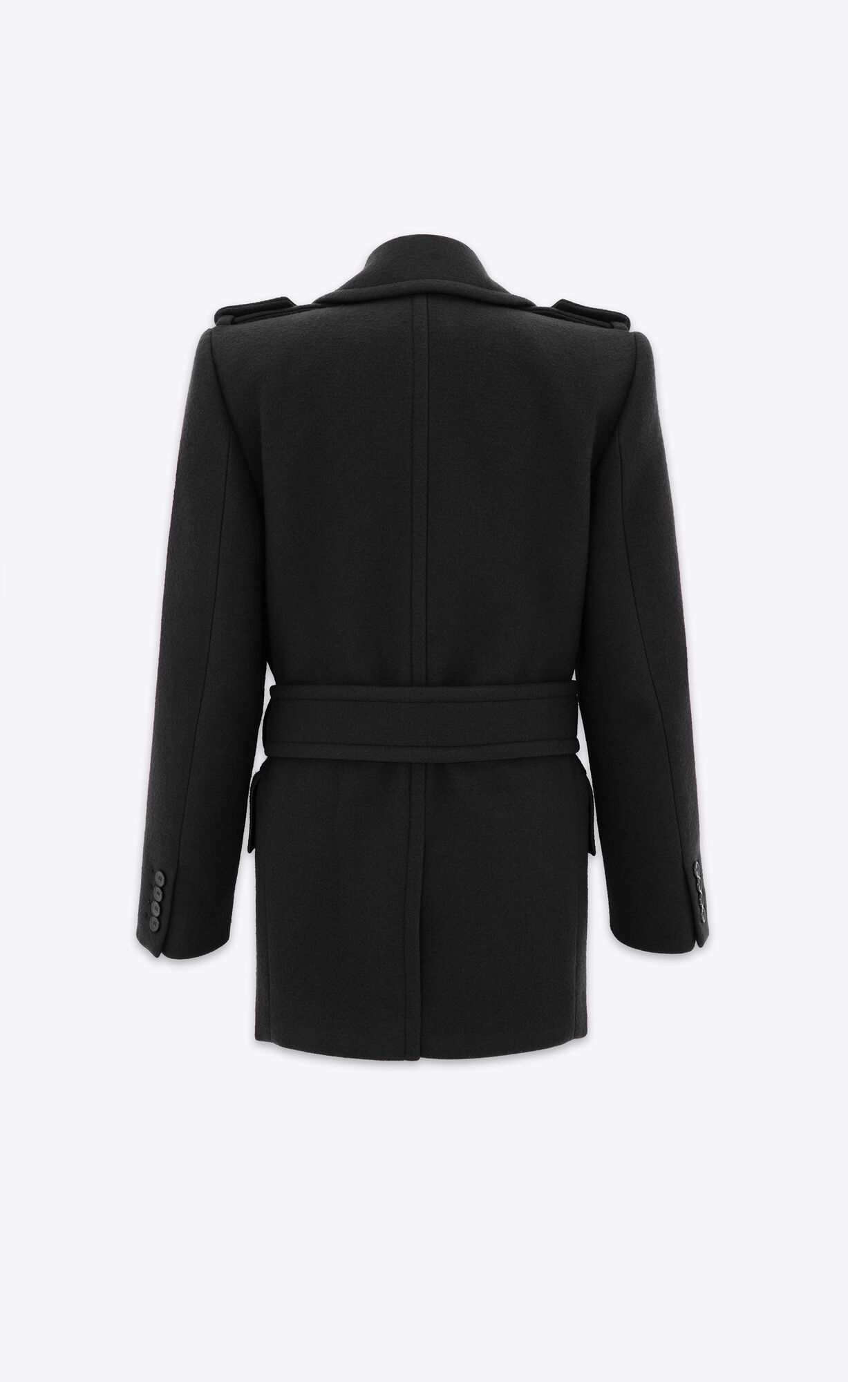 BELTED COAT WITH SHOULDER TABS, JETTED POCKETS AT THE WAIST AND NOTCHED LAPEL.