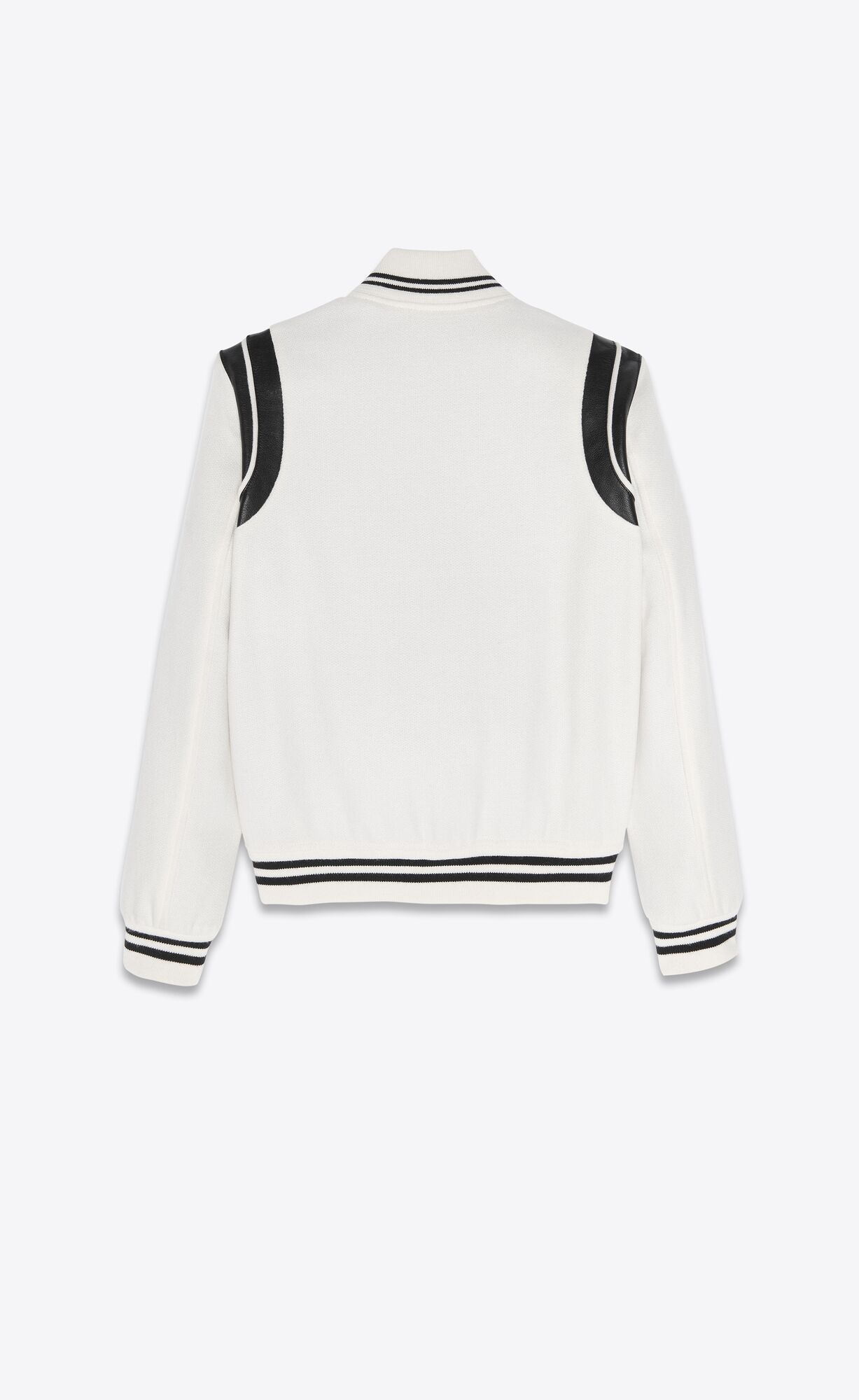 TEDDY JACKET WITH LEATHER TRIM AROUND SHOULDERS AND STRIPED RIBBED COLLAR, CUFFS AND WAISTBAND.